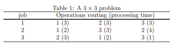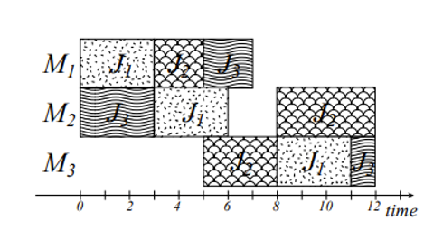 Each job has a set sequence and order of machines that the job has to go through to complete the job, i.e, J1 must go through M1, M2, and M3. The time each job needs at a machine can be different. A job cannot be interrupted when it is being processed by a machine, and the goal is to find a schedule that minimizes the time required to complete all the jobs, L, also called the makespan.